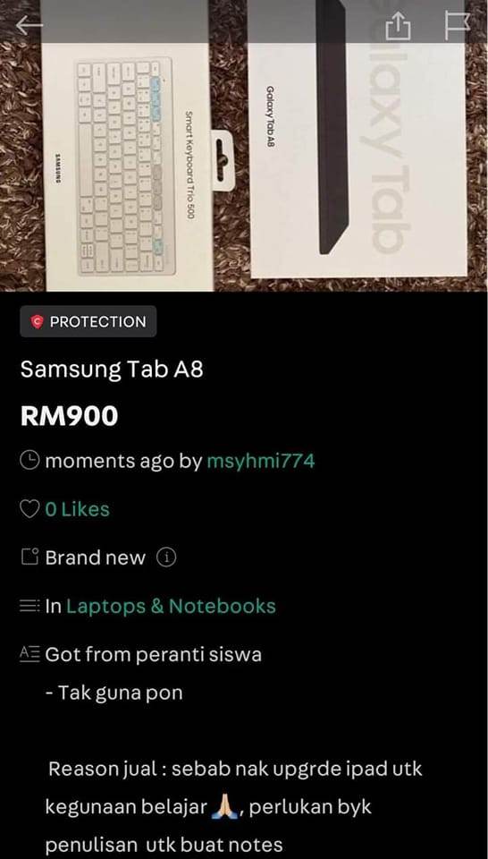 Namun, tak semua pelajar menghargai inisiatif tersebut. Viral di satu platform menjual beli, seorang pelajar tergamak menjual semula gajet Samsung Tab A8 yang diperolehi menerusi PerantiSiswa dengan alasan untuk upgrade kepada iPad.
