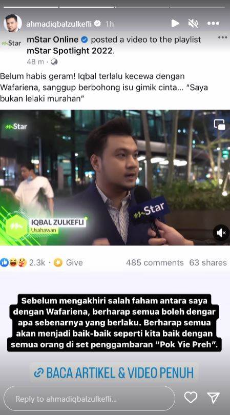 Dalam pada itu, Iqbal turut menegaskan bahawa Wafariena bukanlah gadis idaman yang dia mahukan.