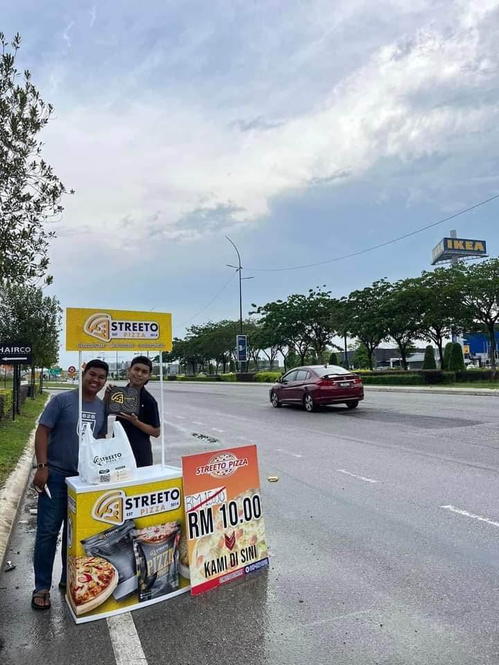 Individu tersebut turut memuat naik beberapa keping gambar yang memaparkan aksi berani dua penjaja piza yang memegang sepanduk dan duduk di meja kiosk yang diletakkan di bahu jalan.