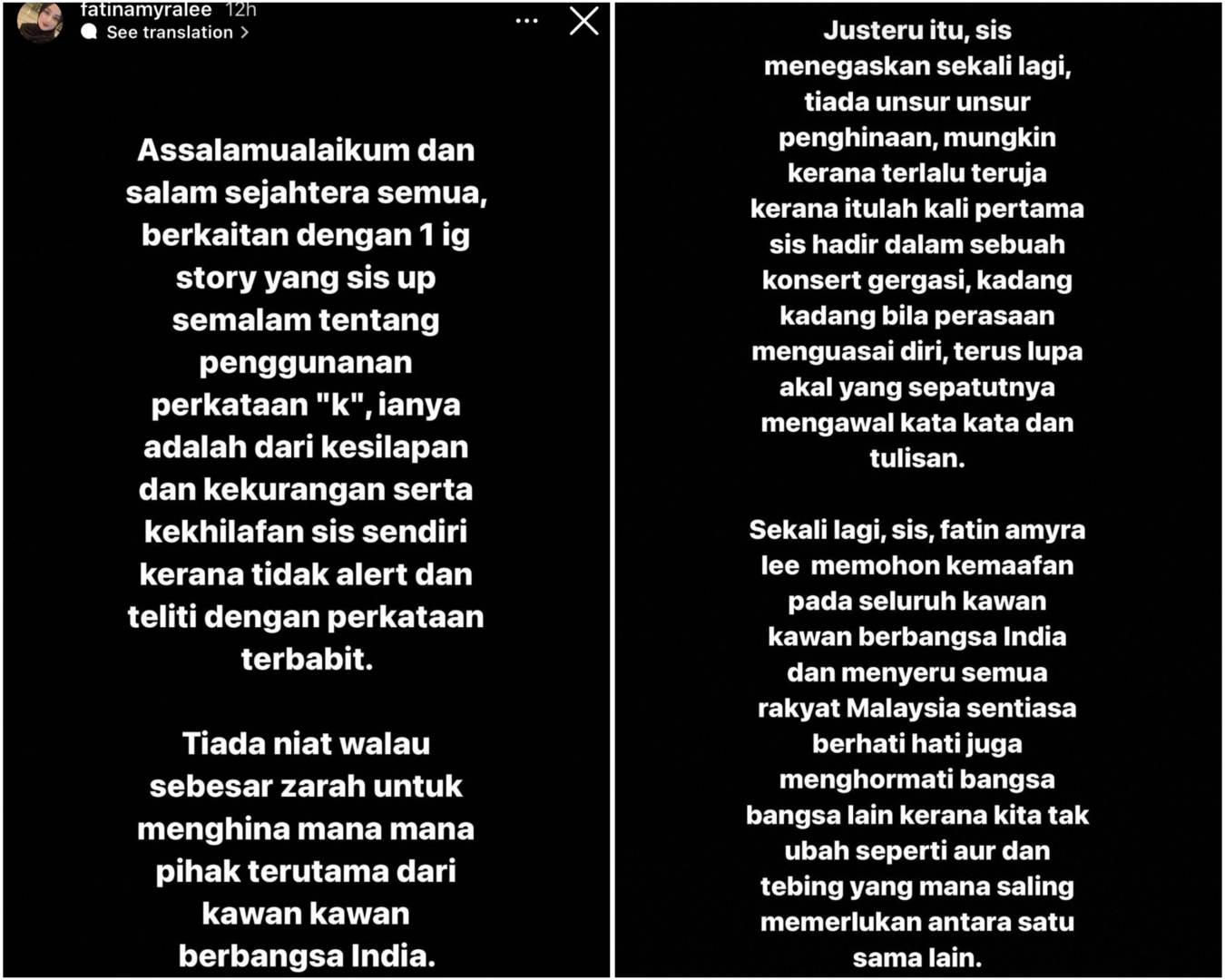 Susulan dikecam hebat oleh netizen influencer tersebut yang bernama Fatin Amyra dilihat telah memuat naik satu permohonan maaf.