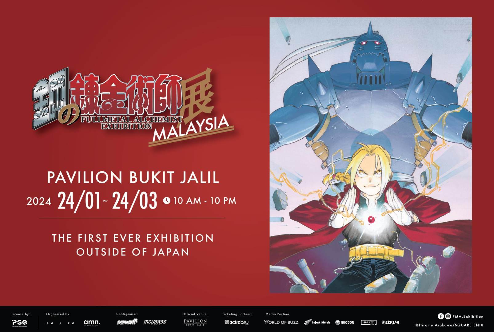 Jadi, buat julung kalinya pameran Fullmetal Alchemist diadakan luar Jepun dan Malaysia berjaya menjadi tuan rumah! Pameran Dunia Manga Fullmetal Alchemist ini bertempat di Pavilion Bukit Jalil bermula dari 24/1/2024 - 24/3/2024!