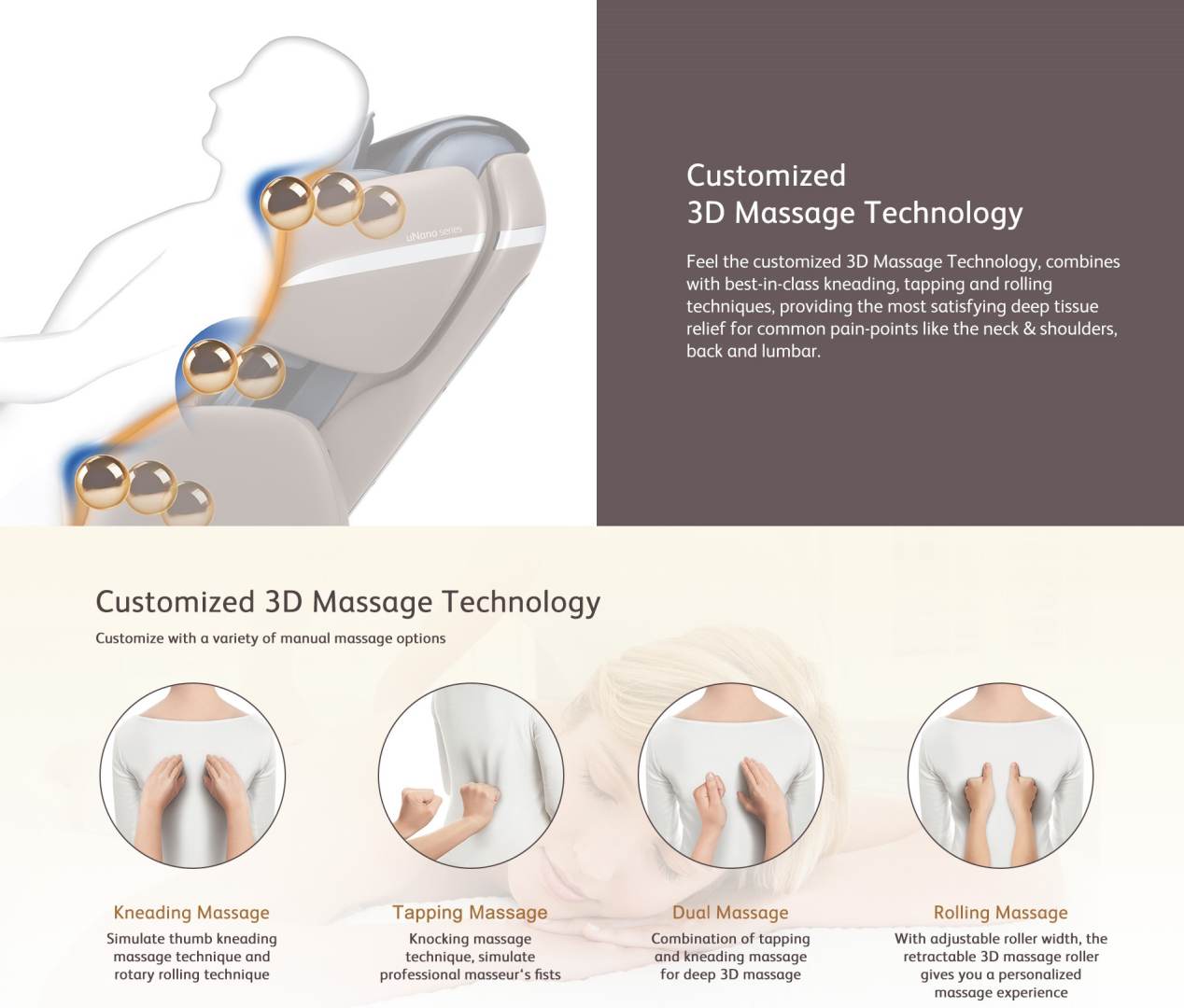 Seiring dengan teknologi canggih, kerusi urut OSIM uNano Series ini juga turut mengaplikasikan penggunaan urutan secara 3D yang menggabungkan teknik menguli, mengetuk dan menggulung.