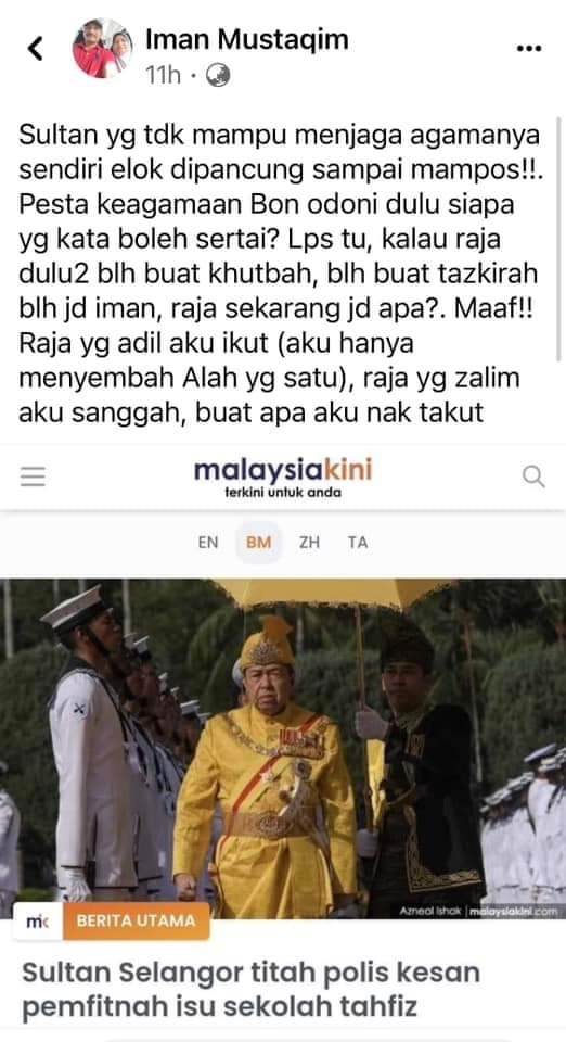 "Berani Buat Berani Tanggung" - Penganggur Dipenjara Buat Posting Jelik Terhadap Sultan Selangor