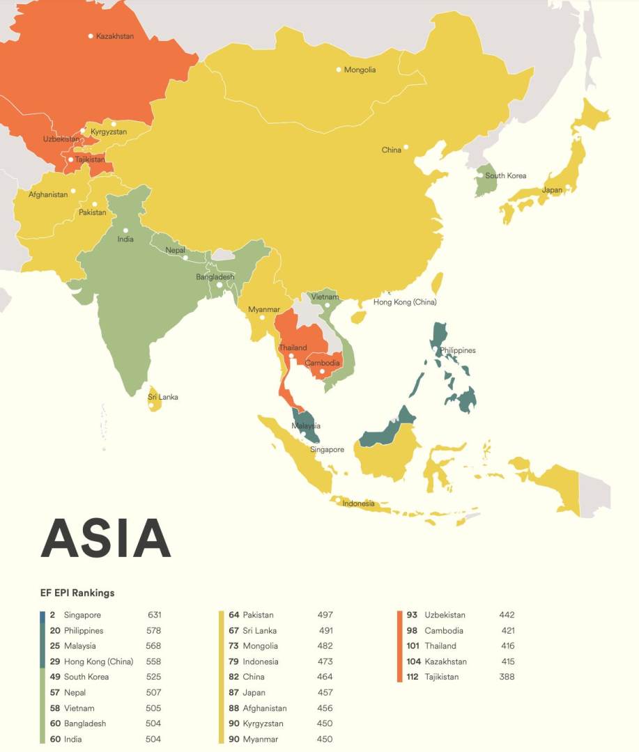 Berdasarkan kedudukan, Malaysia berada di tempat ke-3 tertinggi di Asia yang fasih dalam penguasaan bahasa Inggeris, di belakang Singapura yang berada kedudukan pertama dan Filipina di tempat kedua.