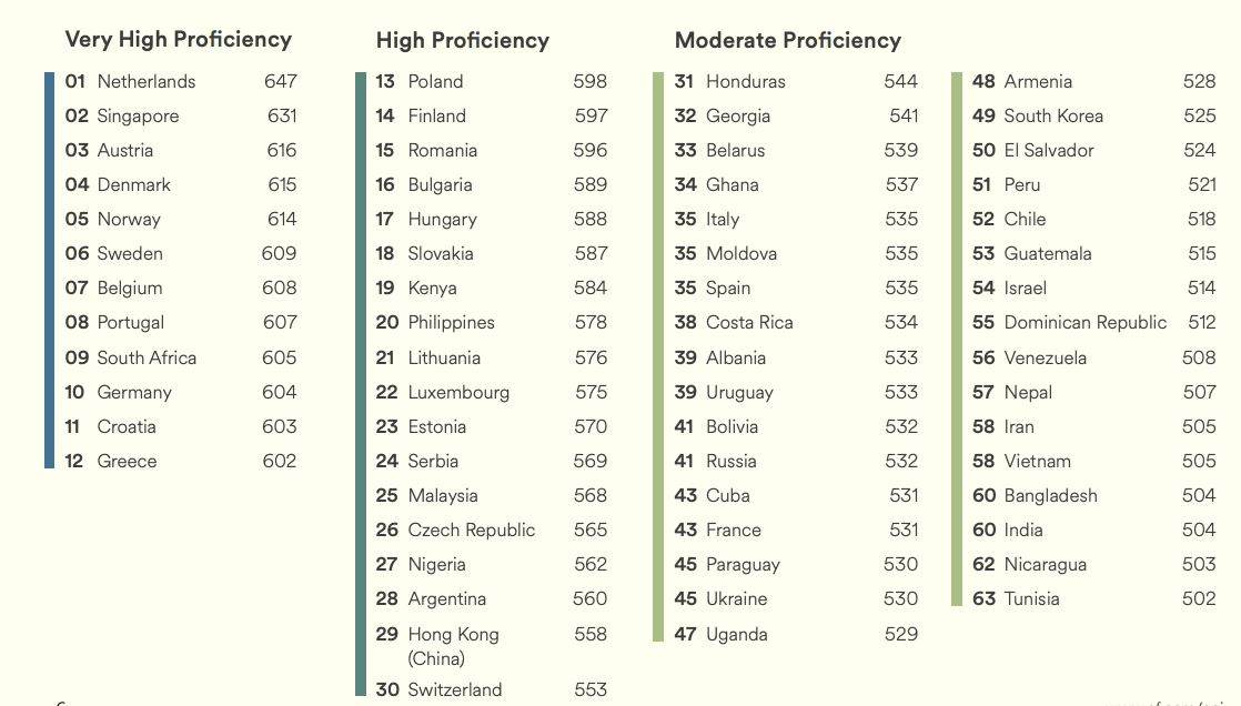 Senarai yang dikeluarkan itu mengandungi 113 negara yang tidak menggunakan bahasa inggeris sebagai bahasa utama. Tinjauan tersebut dilakukan bagi mengukur tahap kecekapan dari tinggi hingga ke rendah dengan Malaysia dikategorikan sebagai peringkat kedua tertinggi.