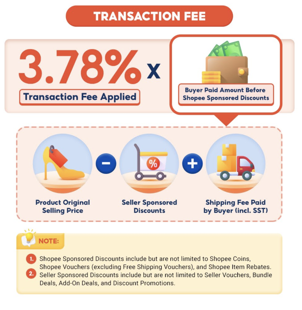 Pada masa ini, Bayaran Transaksi Shopee dikira sebagai 2.12% (termasuk cukai) daripada jumlah pesanan akhir yang dibayar oleh pembeli sebelum 'Shopee Sponsored Discounts'. Shopee akan memotong Bayaran Transaksi secara automatik daripada pembayaran kepada penjual apabila pesanan selesai.
