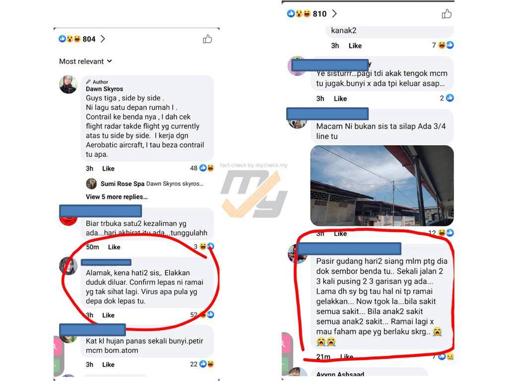 - Wujud dakwaan melalui Facebook menyatakan jalur awan putih yang terbentuk di belakang pesawat yang terbang di langit berbahaya kepada kesihatan manusia.