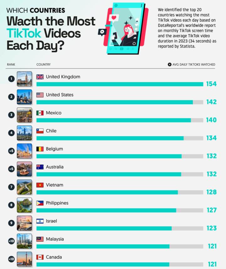 Malaysia berada di tempat kesepuluh (bersama Kanada) negara paling banyak melihat TikTok iaitu sebanyak 121 video sehari.