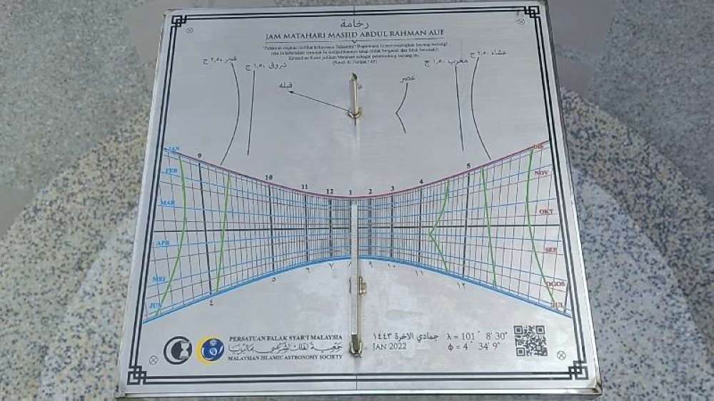 "Untuk makluman, ini adalah yang pertama dalam negeri Perak dan yang pertama di masjid dalam Malaysia yang ada jam matahari ini. Sistem jam ini lebih terperinci dan tepat dengan mempunyai pelbagai fungsi tetapi yang utama adalah menentukan arah, jam dan kiblat," katanya.