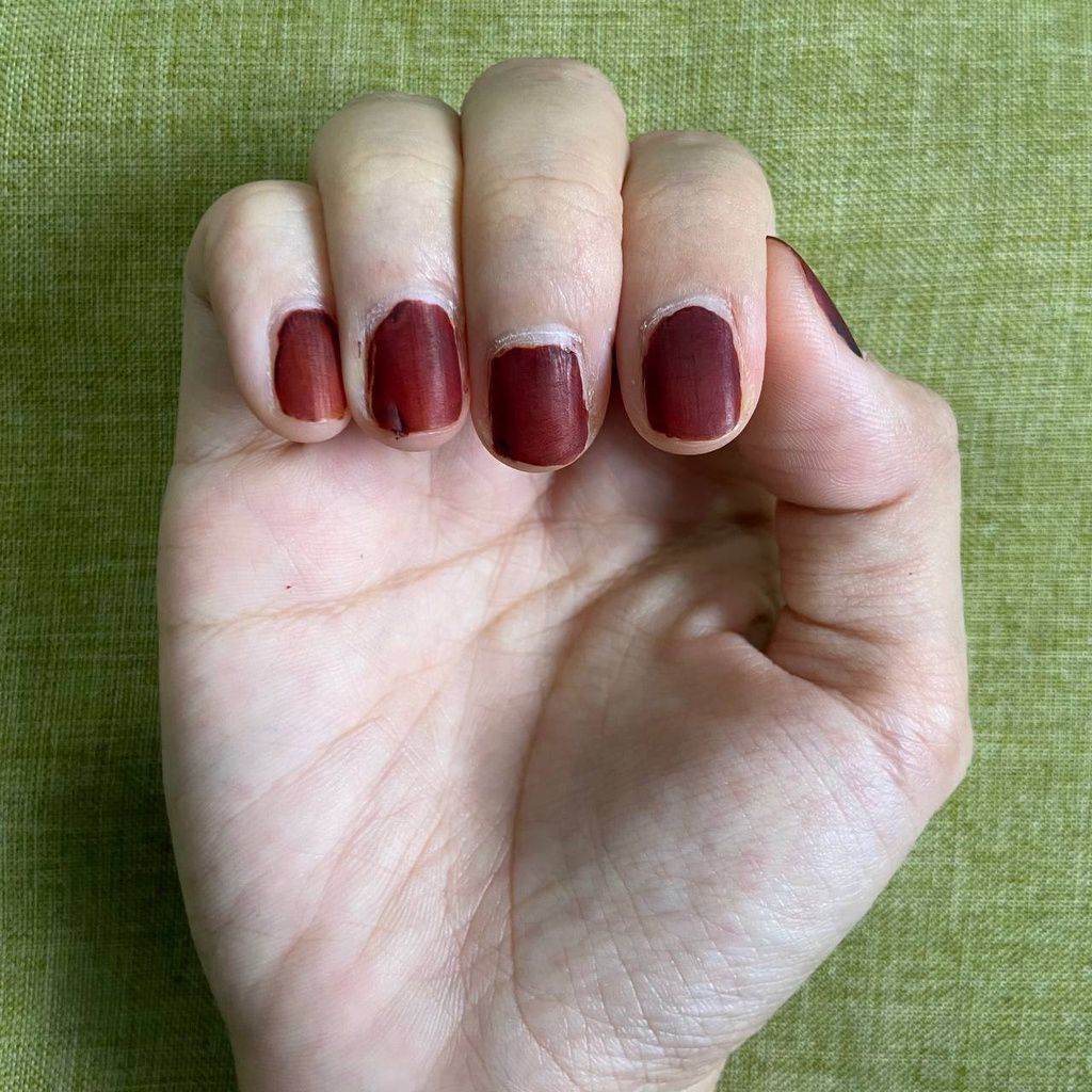 Kemudian, selepas 2-3 hari, saya perasan bahawa apabila jari saya kena air dan sabun, warna inai luntur, tapi dalam bentuk lapisan warna. Ya, saya yakin inai ini membentuk coating layer pada jari saya, sekaligus menghalang air sampai ke kulit saya. Namun, coating layer ini hanya terbentuk pada kawasan jari sahaja. Di kawasan kuku, warnanya nampak sekata dan tidak tertanggal seperti yang berlaku di kulit jari. Ini menambahkan kemusykilan saya, adakah inai celup ini kalis air atau tidak?