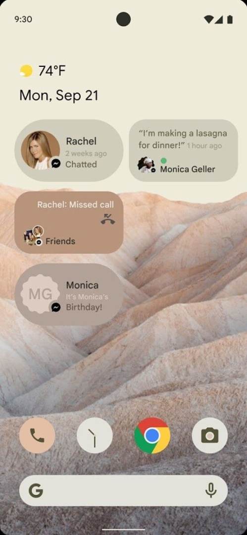 Kebanyakan Launcher juga telah disusun ke bahagian kiri skrin dan ciri 'Weather' pula diletakkan di atas hari dan tarikh. Di gambar atas, korang boleh lihat garisan hitam yang berkemungkinan besar menunjukkan pengguna boleh menarik skrin tersebut ke bawah untuk keluar dari paparan tersebut. Dan kebanyakan paparan widget sudah semakin bulat berbanding Android 11.