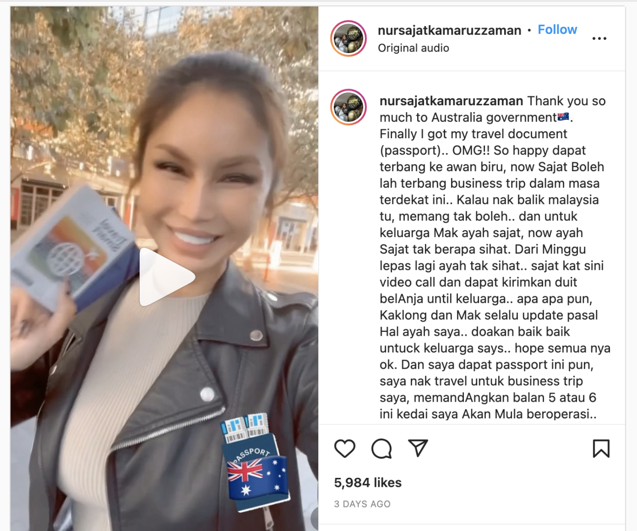 GAYA HIDUPWalaupun berada jauh di negara kanggaro nama Sajat masih lagi tidak pernah hilang dari bualan rakyat Malaysia. Teruja dengan perkongsian yang dia kini sudah menerima ‘pasport’ di Australia mengundang kecaman apabila "passport" yang diterimanya dikatakan hanyalah pas pelarian.