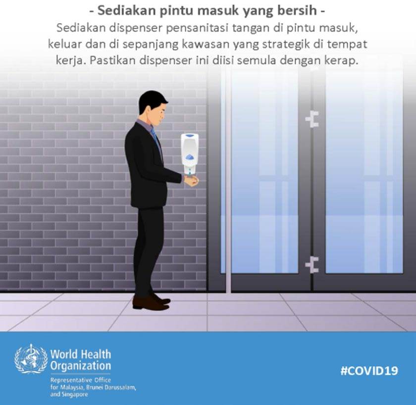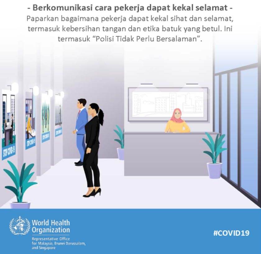 Namun sebelum anda kembali bertugas, jom kita ikuti 11 saranan World Health Organisation (WHO) demi keselamatan dan kesihatan kita bersama ketika berada di premis tempat kerja.