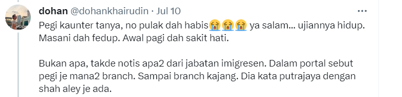 Sesampai sahaja Dohan ke sana, nombor giliran pula habis kerana Pejabat Imigresen hanya menerima 100 permohonan sehari. Ciapnya di Twitter jelas kecewa kerana tiada sebarang notis atau pemberitahuan yang dikeluarkan Jabatan Imigresen.