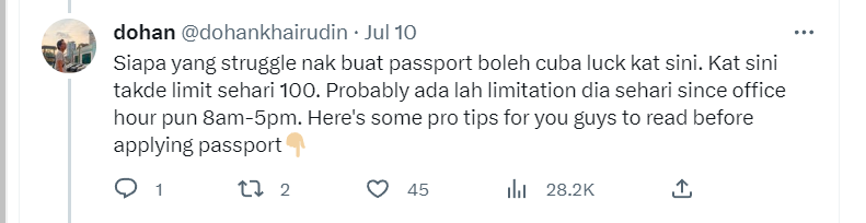 "Oh rupanya benda ni baru. Tak ramai pun yang tahu kewujudan tempat ni. Sebab memang recently launched. Tapi masa ni pasrah, kalau sampai, nombor giliran habis, kita pergi next time jelah. Tapi niat ke sini sebab passport siap dalam masa 1 jam!" ciap Dohan.