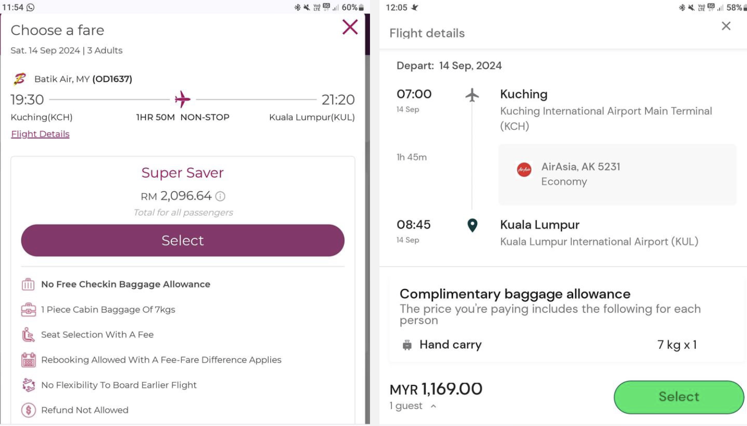 Selain itu, satu lagi tangkap layar menunjukkan penerbangan Batik Air dari Kuching ke Kuala Lumpur dengan harga RM2,096.64 untuk tiga orang dewasa. Penerbangan ini mengambil masa 1 jam 50 minit tanpa sebarang transit, namun harga ini juga tidak termasuk bagasi berdaftar. Penumpang hanya diberikan hak untuk membawa satu beg kabin seberat 7kg tanpa caj tambahan.