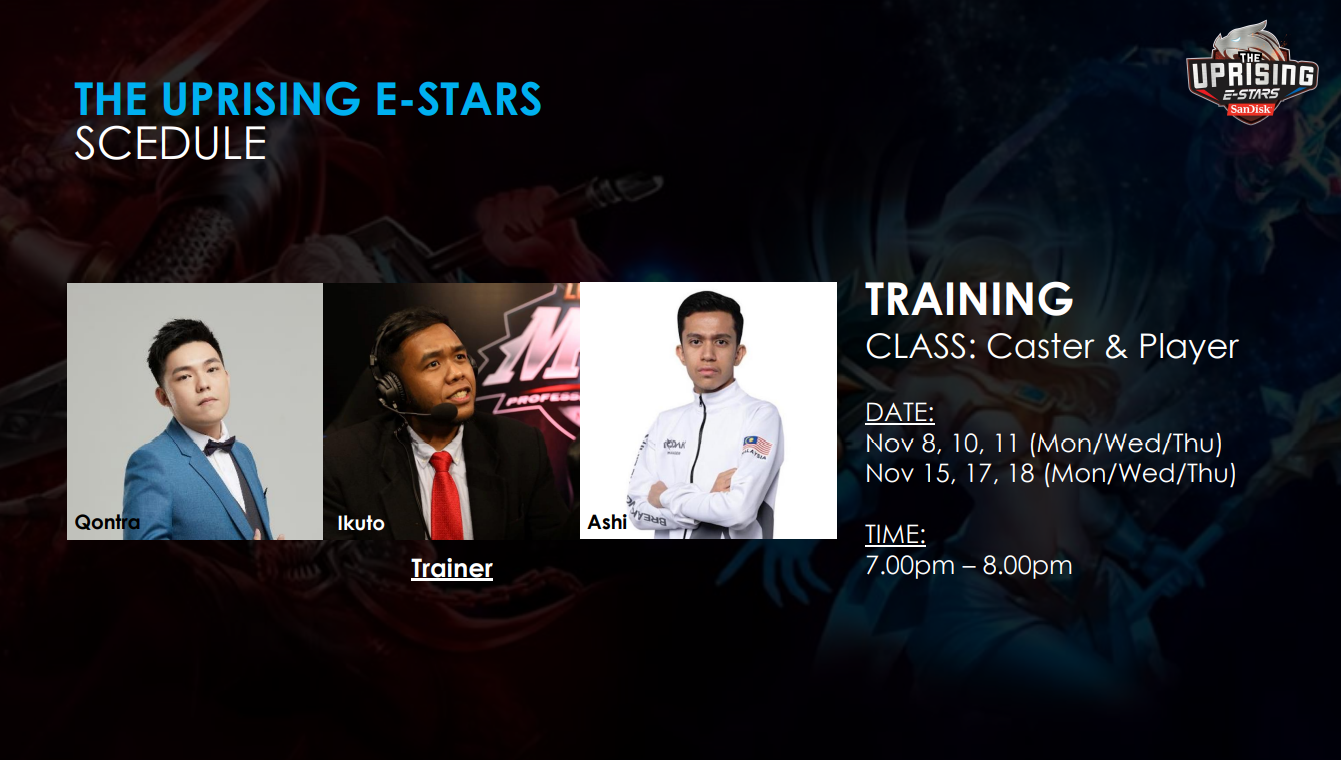 Setiap sesi latihan akan dijalankan melalui aplikasi Zoom pada November 8, 10 dan 11 dan ianya terbuka kepada semua yang berminat menjadi caster. Bagi player pula, tarikh class tersebut adalah pada 15, 17 dan 18 November, masa bagi setiap kelas ini adalah pada pukul 7 pm hingga 8 pm.
