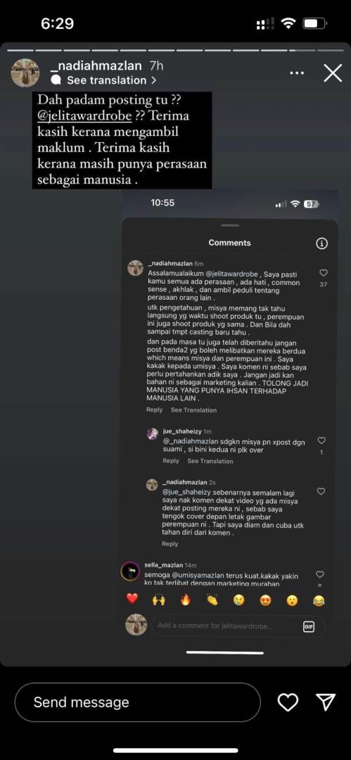 Hal tersebut membuatkan kakak Misya Mazlan iaitu Nadiah Mazlan tampil memberi penjelasan dan menegur perbuatan pihak butik.