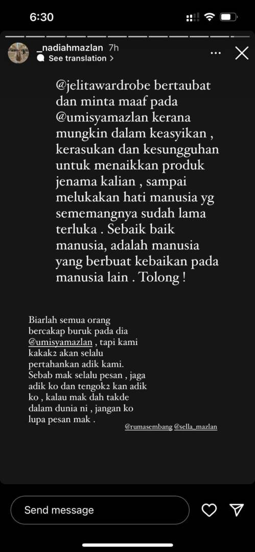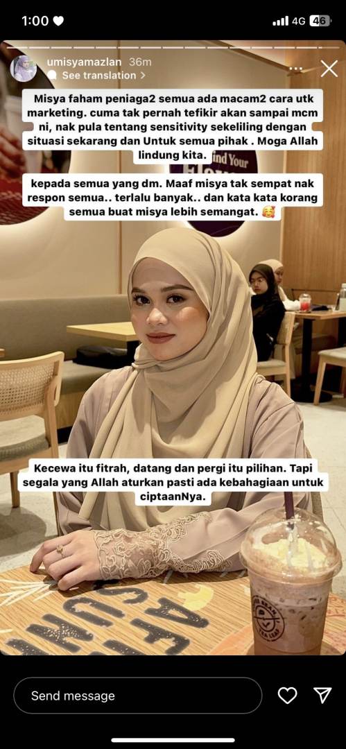“Bertaubat dan minta maaf kepada @umisyamazlan kerana mungkin dalam keasyikan, kerasukan, dan kesungguhan untuk menaikkan produk jenama kalian, sampai melukakan hati manusia yang sememangnya sudah lama terluka,” katanya.