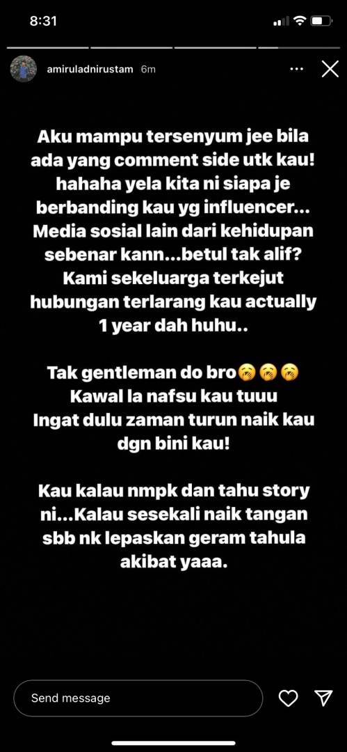 "Kau kalau dah nampak dan tahu story ini... Kalau sesekali naik tangan sebab nak lepaskan geram tahulah apa akibatnya yaa," tegas lelaki itu dalam story Instagram yang lain.
