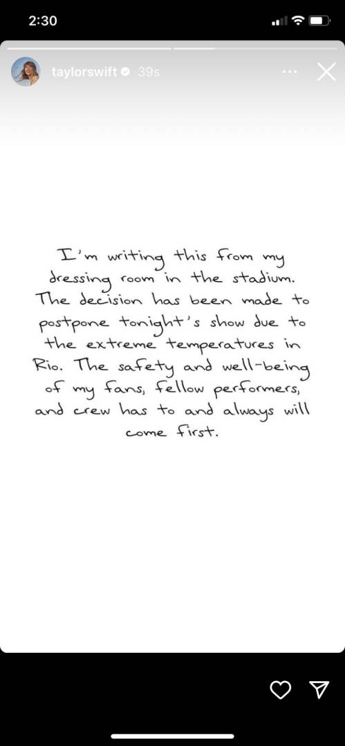 HIBURANBintang pop Hollywood, Taylor Swift telah menangguhkan persembahannya pada Sabtu di Rio de Janeiro akibat cuaca yang panas, sehari selepas kematian seorang peminat yang jatuh sakit di tempat konsert.