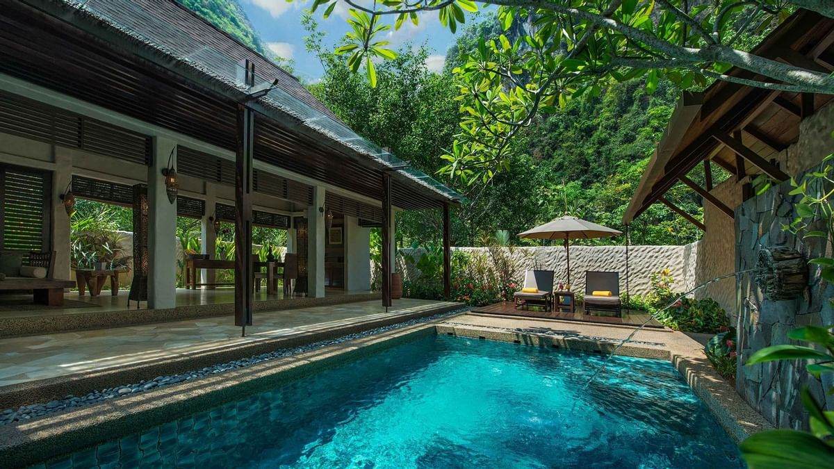 Villa resort mewah ini menawarkan 45 villa dan terdapat tiga jenis villa yang sesuai dengan bajet anda! Setiap villa mempunyai daya tarikan tersendiri. The Lake Villa dilengkapi dengan permandangan tasik yang memukau, Water Villa yang menghadap terusan air yang menenangkan, manakala Garden Villa merupakan villa yang paling besar, dilengkapi dengan permandangan gua dan hutan yang lebat! Setiap penginapan dilengkapi dengan kolam renang peribadi, hot tub outdoor.