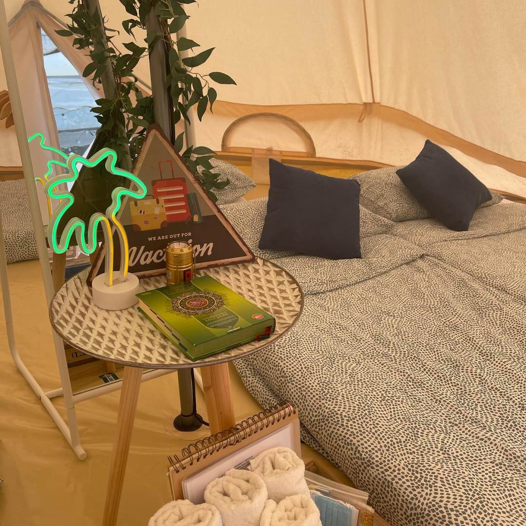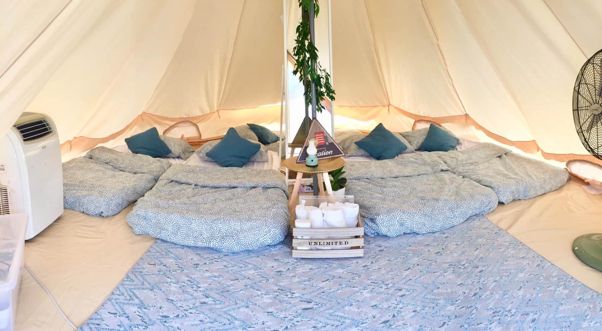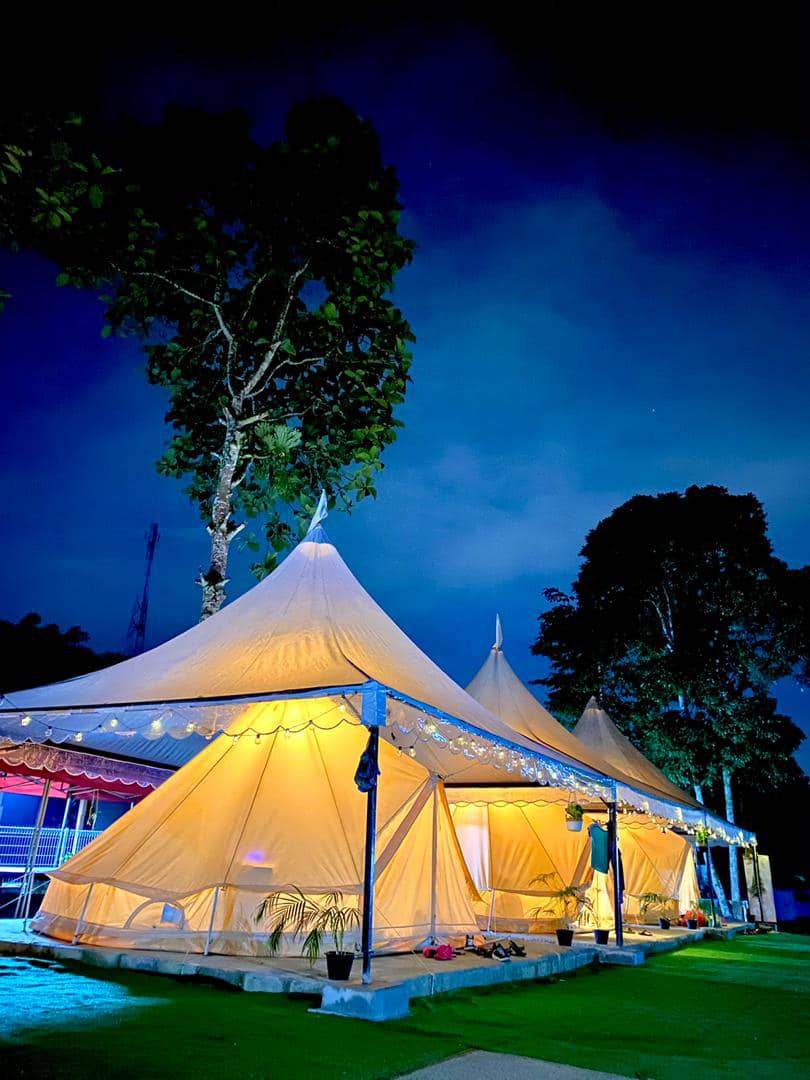 Setiap khemah glamping mampu memuatkan seramai 5 orang tetamu kerana disediakan lima buah tilam, kipas mudah alih, penghawa dingin dan akses ke bilik air berdekatan.