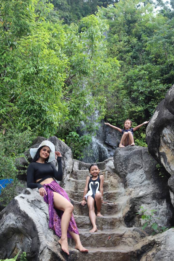 Airnya deras mengalir menuruni tembok batu tegak yang sengaja dibina untuk melengkapi landskap bertemakan air itu. Melihat latar hutan di sekitar, sungguh mendamaikan. Bersatu dengan warna biru kolam, membuat persekitaran rasa redup lagi nyaman.