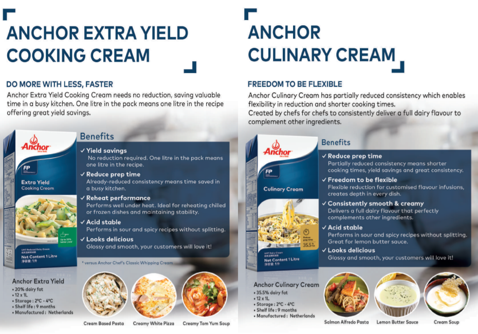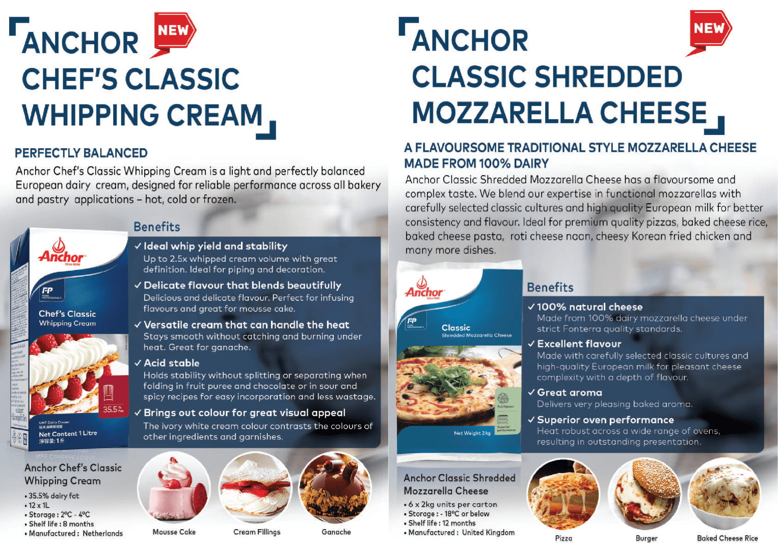 The European-style dairy range memperkenalkan empat produk iaitu Anchor Chef’s Classic Whipping Cream, Anchor Culinary Cream, Anchor Extra Yield Cooking Cream and Anchor Classic Shredded Mozzarella Cheese.