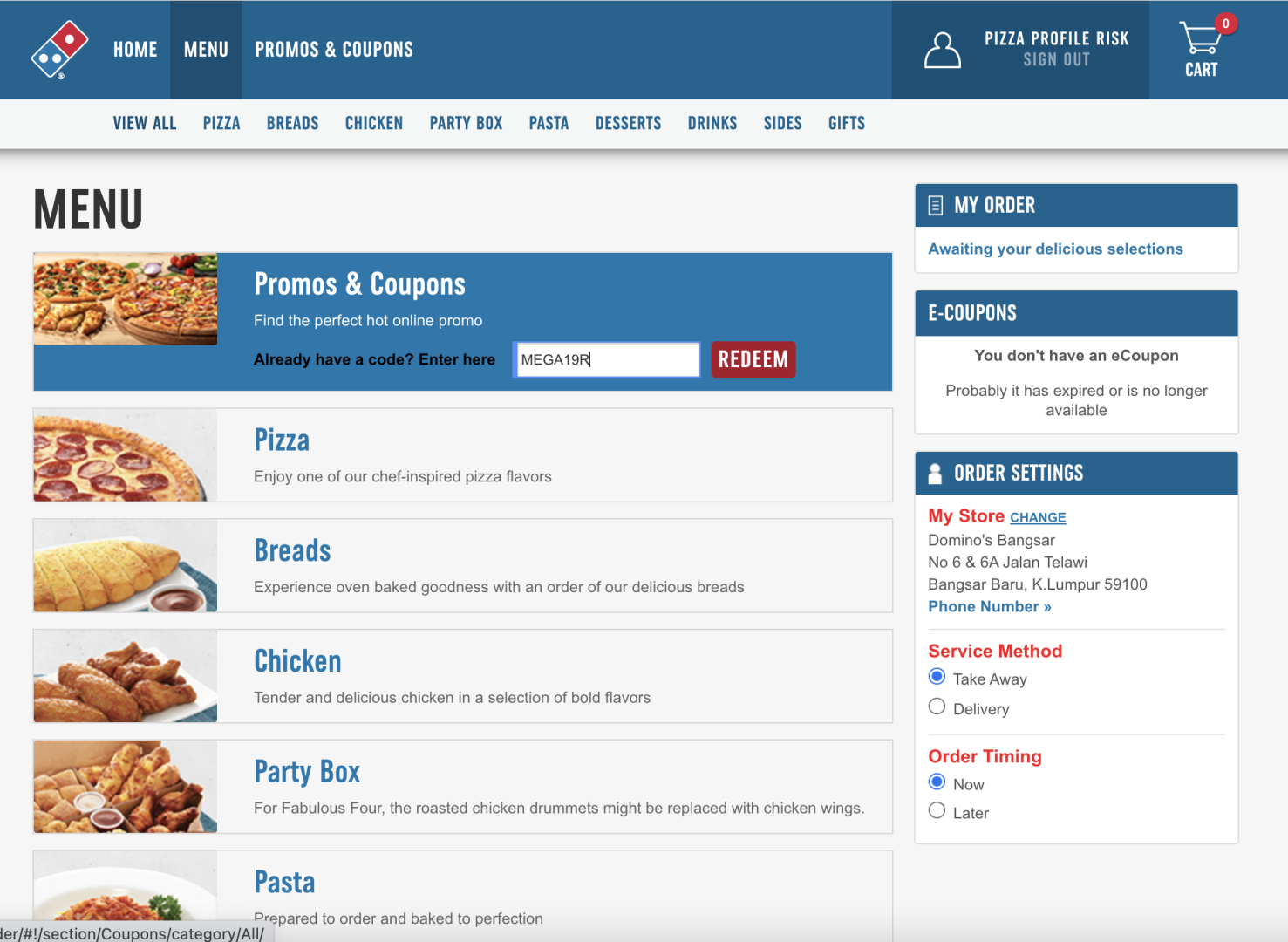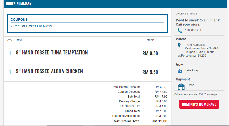 Tak susah pun, korang pesan je Take Away dari www.dominos.com.my dan pada bahagian Promos & Coupons gunakan kod MEGA19R dan korang boleh nikmati 2 piza saiz regular Domino’s Pizza pada harga RM19! Kalau nak pesan saiz large, gunakan kod MEGA19L, dan MEGA19XL until xtra large!