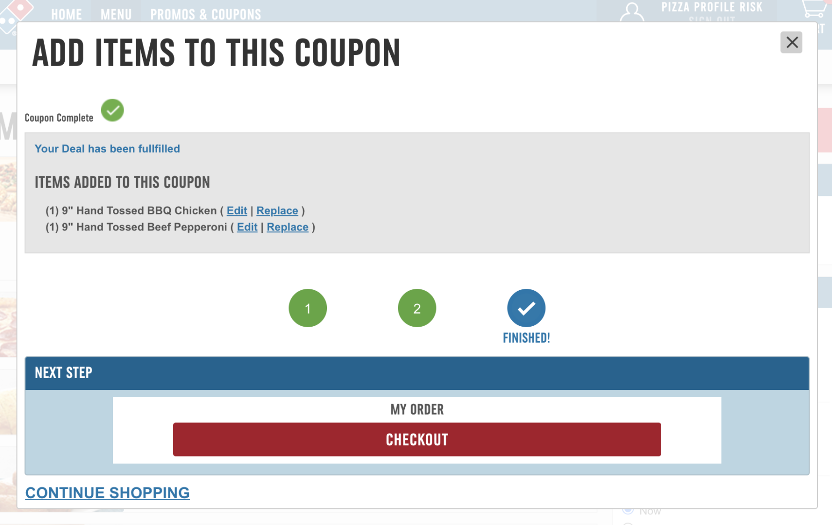 4. Tambahkan 2 pilihan piza pada pesanan anda, dan checkout!