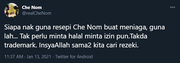 Pengumuman tersebut dilakukan di Twitter @realCheNom. Beliau berkata tak perlu minta izin pun, dan kesemua content atau resipi masakan yang digunakan tak ada trademark pun. Malah beliau juga turut memberi izin menggunakan gambar official resipi dari website utama untuk tujuan buat sticker atau banner. Wah, terharu sungguh bila baca tweet tu.