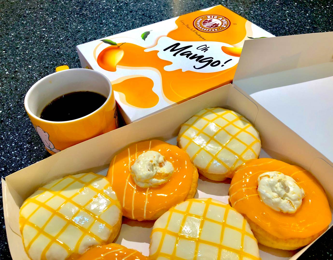 Bosan dengan hidangan yang biasa-biasa? Apa kata anda cuba bertukar selera dengan donat Oh Mango! keluaran baharu daripada Big Apple Donuts & Coffee. Donat berperisa mangga ini semestinya bukan biasa-biasa kerana ia dipenuhi dengan gabungan isi buah mangga segar berserta krim mangga yang bakal menambahkan lagi kelazatannya ketika dinikmati bersama keluarga dan rakan-rakan.