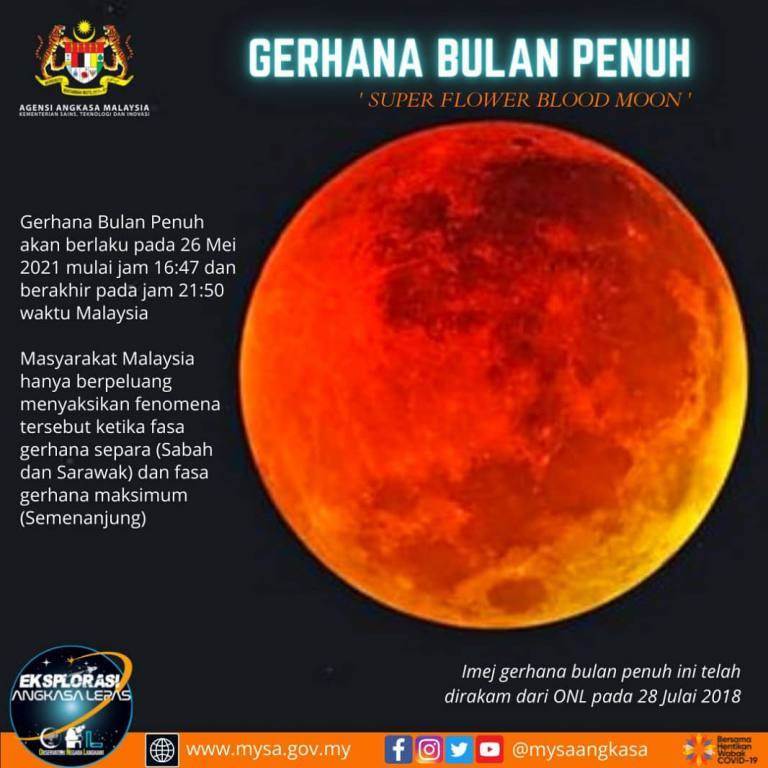 Namun kini, kita hanya dapat menyaksikan menerusi penstriman langsung Gerhana Bulan Penuh di akaun media sosial Planetarium Negara pada hari Rabu, 26 Mei 2021 ini.