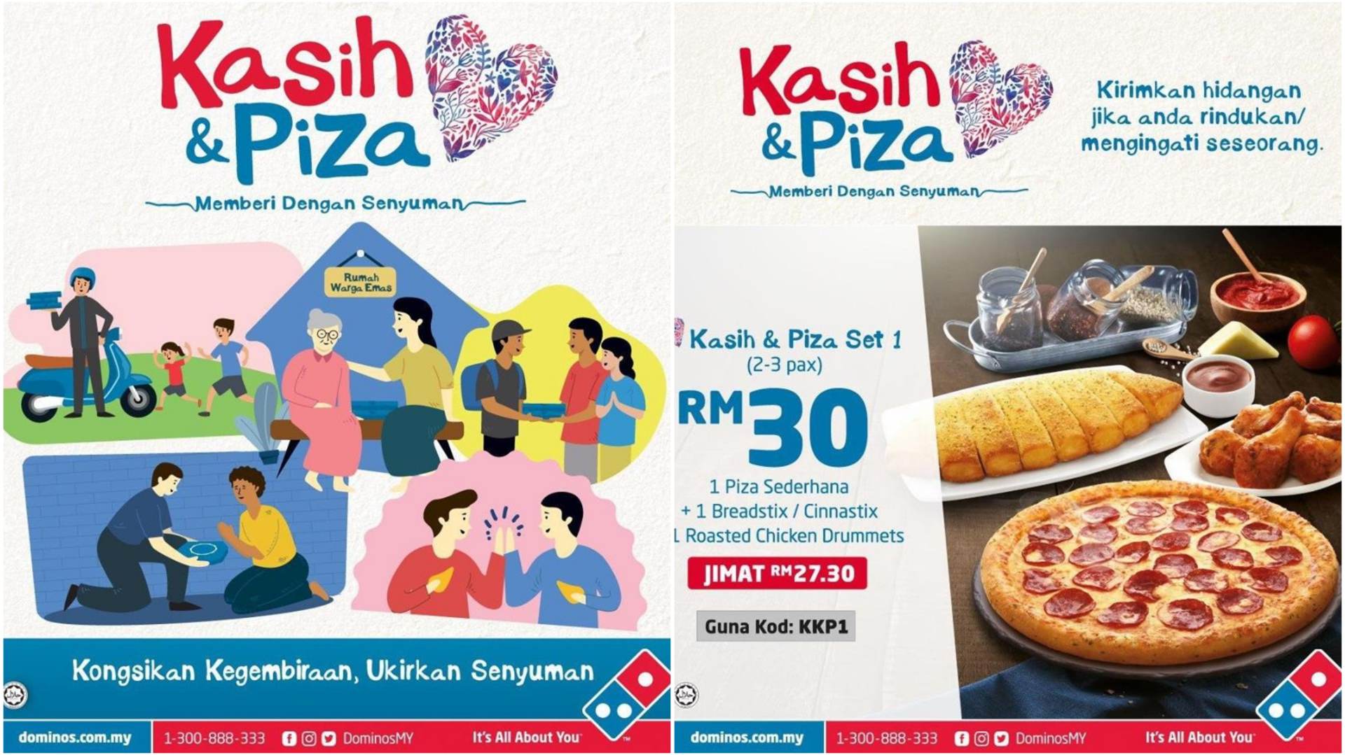 Program 'Kasih & Piza' adalah satu cara untuk sesiapa sahaja mendekati dan berkongsi pengalaman piza Domino's, dengan pilihan set hidangan 'Kasih & Piza' sama ada pakej RM30 (jimat RM27.30), RM50 (jimat RM48.70) dan RM100 (jimat RM110.20).