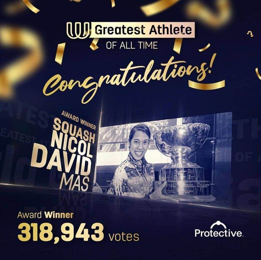 TERKINIBekas ratu skuasy negara Datuk Nicol David kini telah dinobatkan sebagai pemenang Anugerah Atlet Terunggul Sepanjang Zaman Sukan Dunia pada jam 9 malam semalam. Pencapaian ini sangat membanggakan kerana Datuk NIcol merupakan satu-satunya calon dari Asia untuk menerima anugerah tersebut. Anugerah tersebut dibuat berdasarkan undian dan Datuk Nicol menerima 318,943 undian.