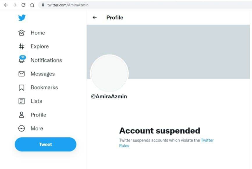 Bagaimanapun, tidak lama kemudian akaun Twitter dengan nama @AmiraAzmin itu telah digantung.