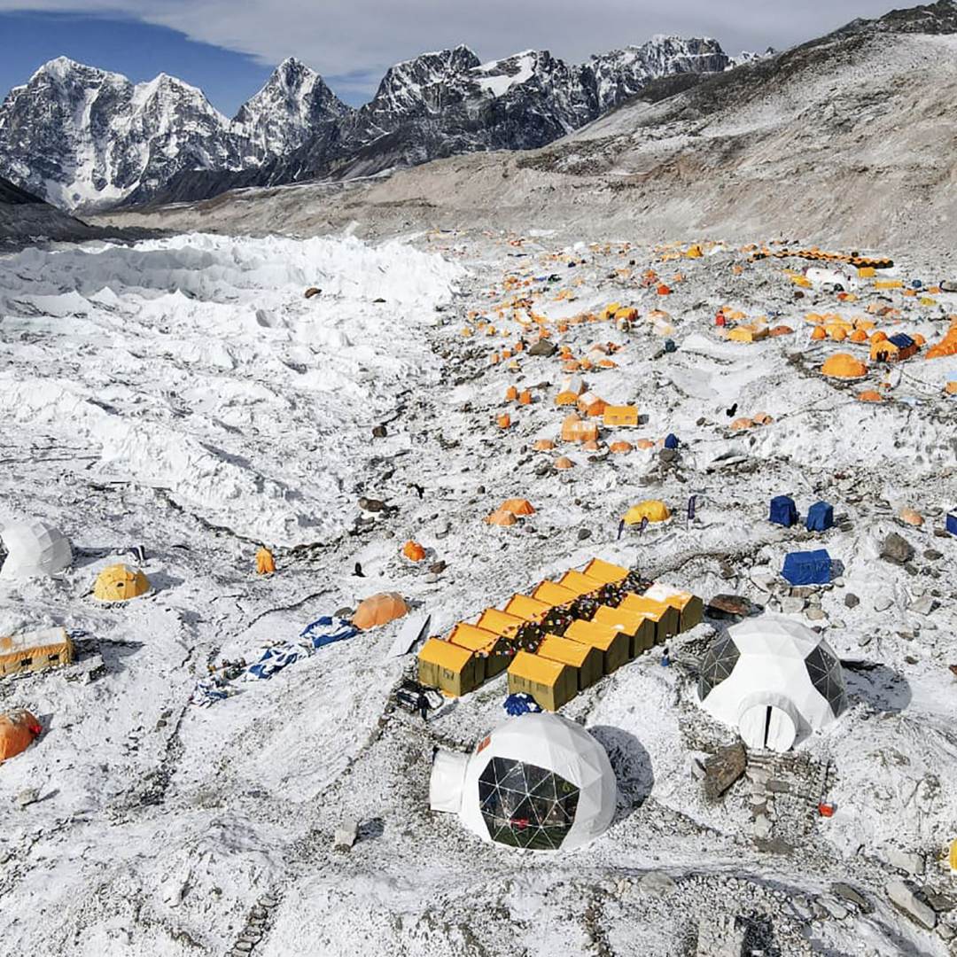 Kem yang digunakan oleh sehingga 1,500 orang pada musim pendakian ketika musim bunga, terletak di glasier Khumbu yang semakin menipis.