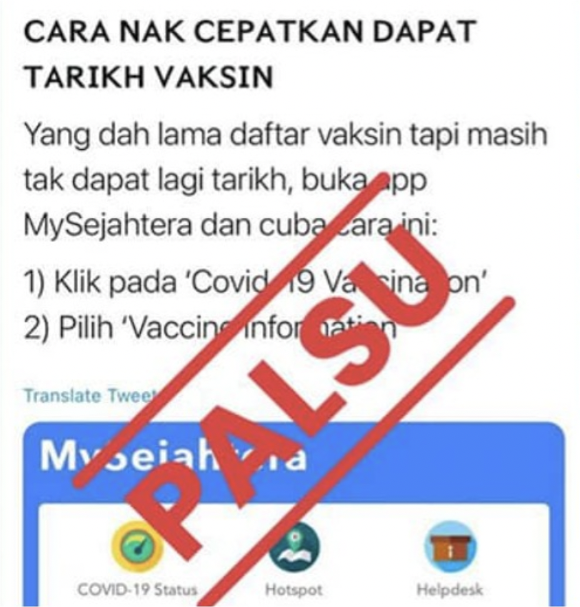 Baru-baru ni memang ada tular ada pengguna yang kongsikan cara bagi mendapatkan vaksin dengan lebih cepat iaitu melalui 'HelpDesk' MySejahtera di mana pengguna disarankan untuk memohon sejenis jenama vaksin tertentu agar nama mereka dapat diberikan tarikh vaksinasi lebih awal.