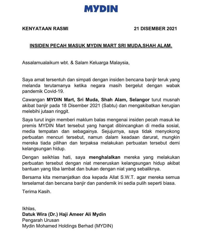 "Saya ingin memberi maklum balas mengenai insiden pecah masuk ke premis Mydin Mart yang hangat dibincangkan di media sosial, media tempatan dan sebagainya.