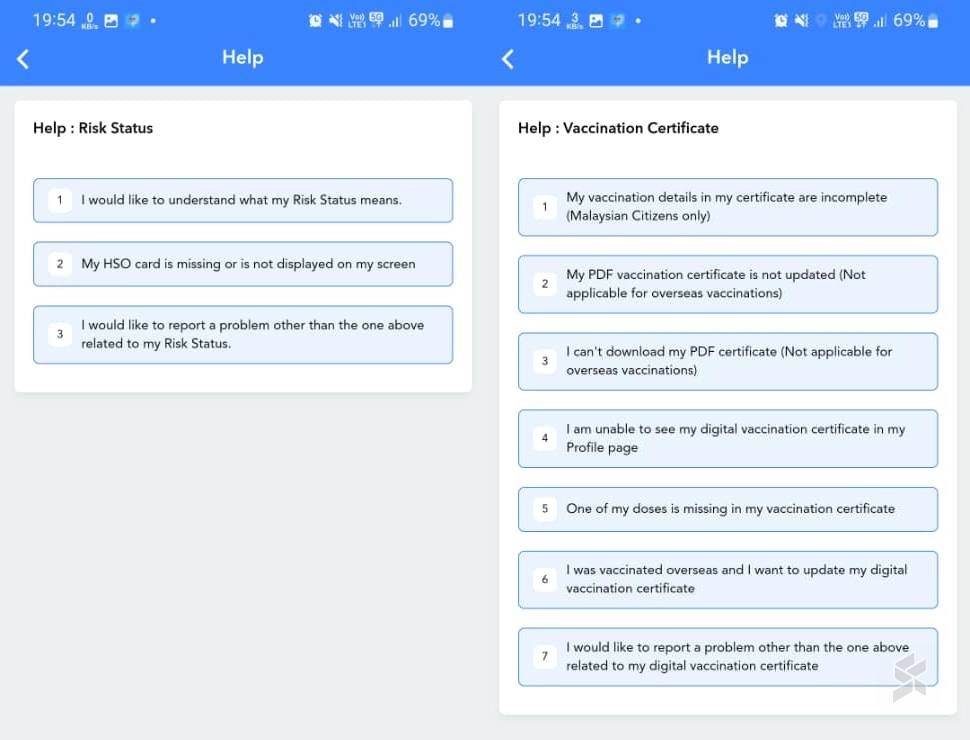 Apabila tekan padanya, anda boleh melaporkan kad HSO hilang atau tidak tertera di skrin, masalah berkaitan status risiko, sijil vaksinasi tidak lengkap, dan sebagainya.