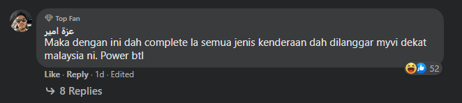 Seperti biasa, apabila ada kemalangan yang melibatkan Myvi, netizen sering terhibur dengan kekuatan dan keteguhan kereta tersebut. Memang kelakar dan mencuit hati komen-komen daripada netizen berkenaan kes ini. Apa pun yang penting kedua pemandu tersebut selamat. Dan korang sila berhati-hati dalam memandu okay?
