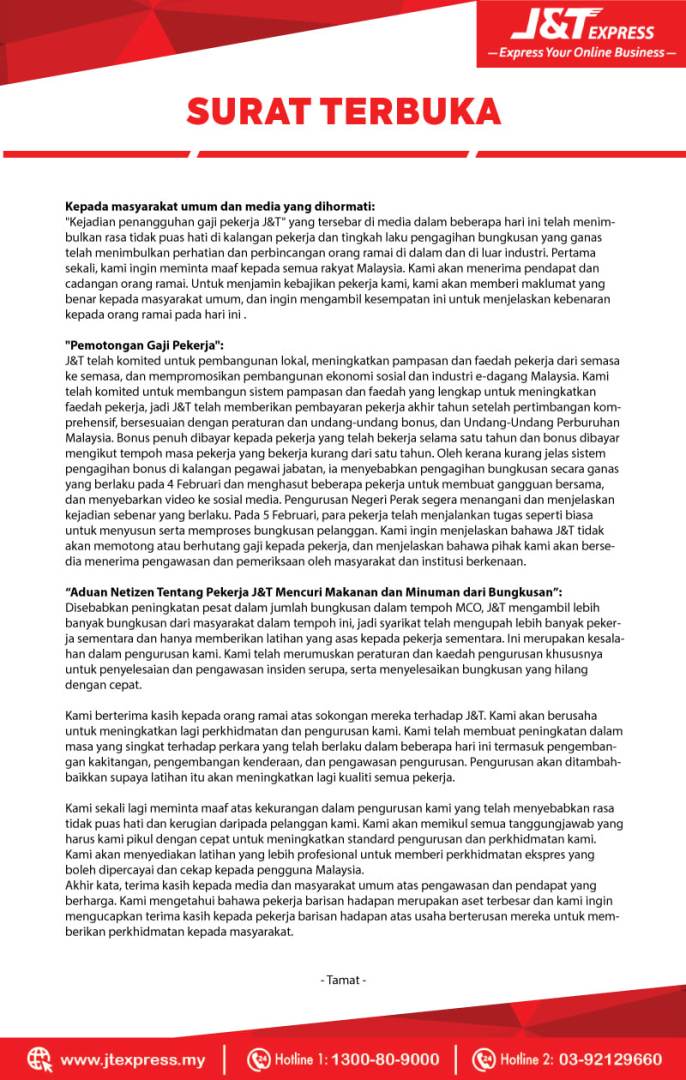 Sehubungan dengan itu, syarikat J&T Express telah mengeluarkan satu kenyataan di laman Facebook mereka. Pihak J&T mengakui kelemahan pengurusan mereka sehingga menyebabkan salah faham dalam kalangan pekerja.