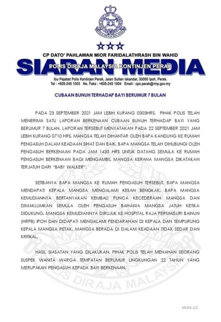 TERKINIKes viral yang mengejutkan para netizen pada minggu lepas iaitu seorang bayi didakwa telah didera oleh pengasuhnya menjadi bualan ramai kerana tindakan yang tidak berhati perut itu. Kejadian tersebut berlaku di Ipoh, Perak.