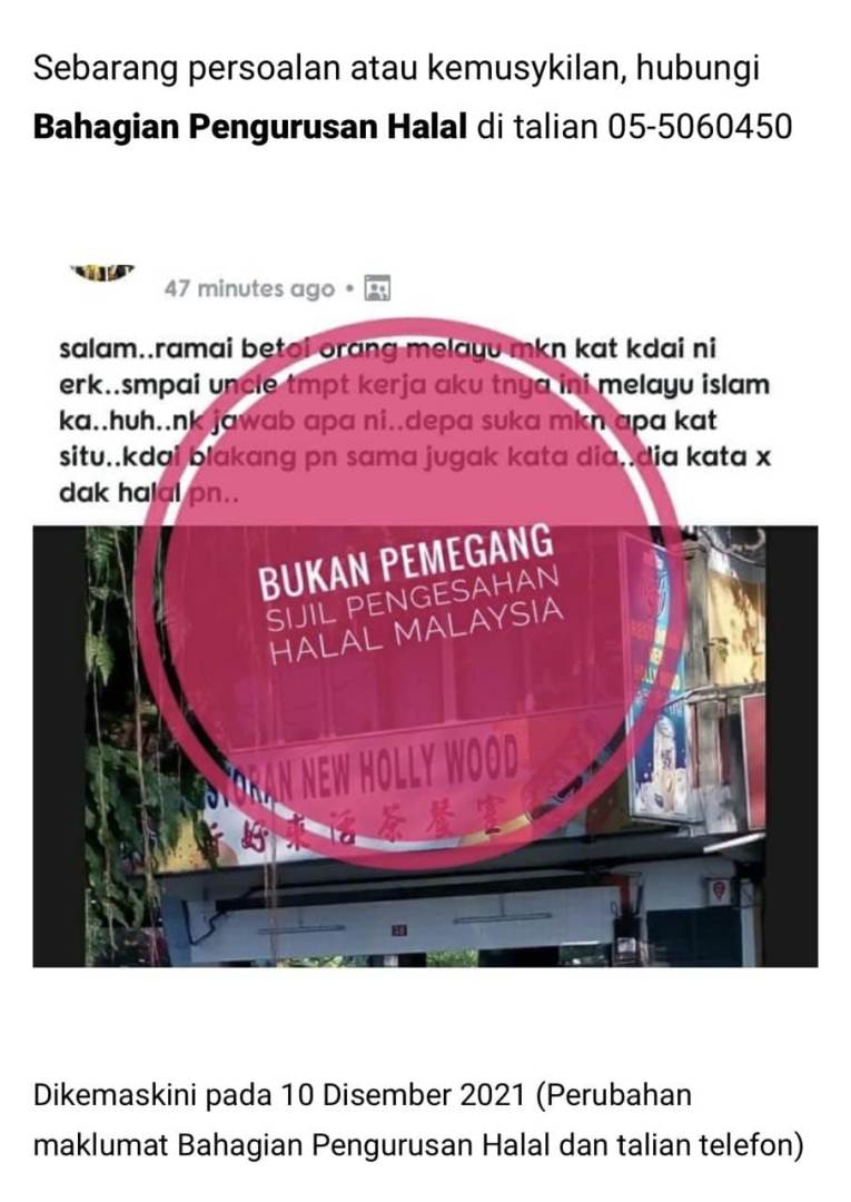 Menerusi kenyataan di laman web rasminya yang dikemaskini pada 10 Disember 2021 -- JAIPk mengesahkan bahawa restoran New Hollywood ini bukanlah pemegang sijil halal Malaysia.