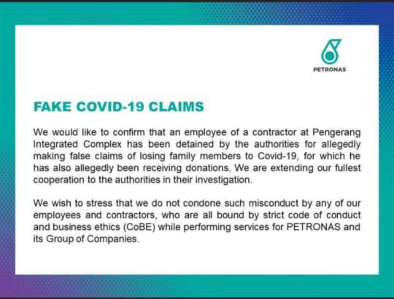 Terdahulu Petronas dalam kenyataan menafikan dakwaan seorang individu yang merupakan kakitangan kontraktornya telah kehilangan 14 ahli keluarga akibat wabak Covid-19.