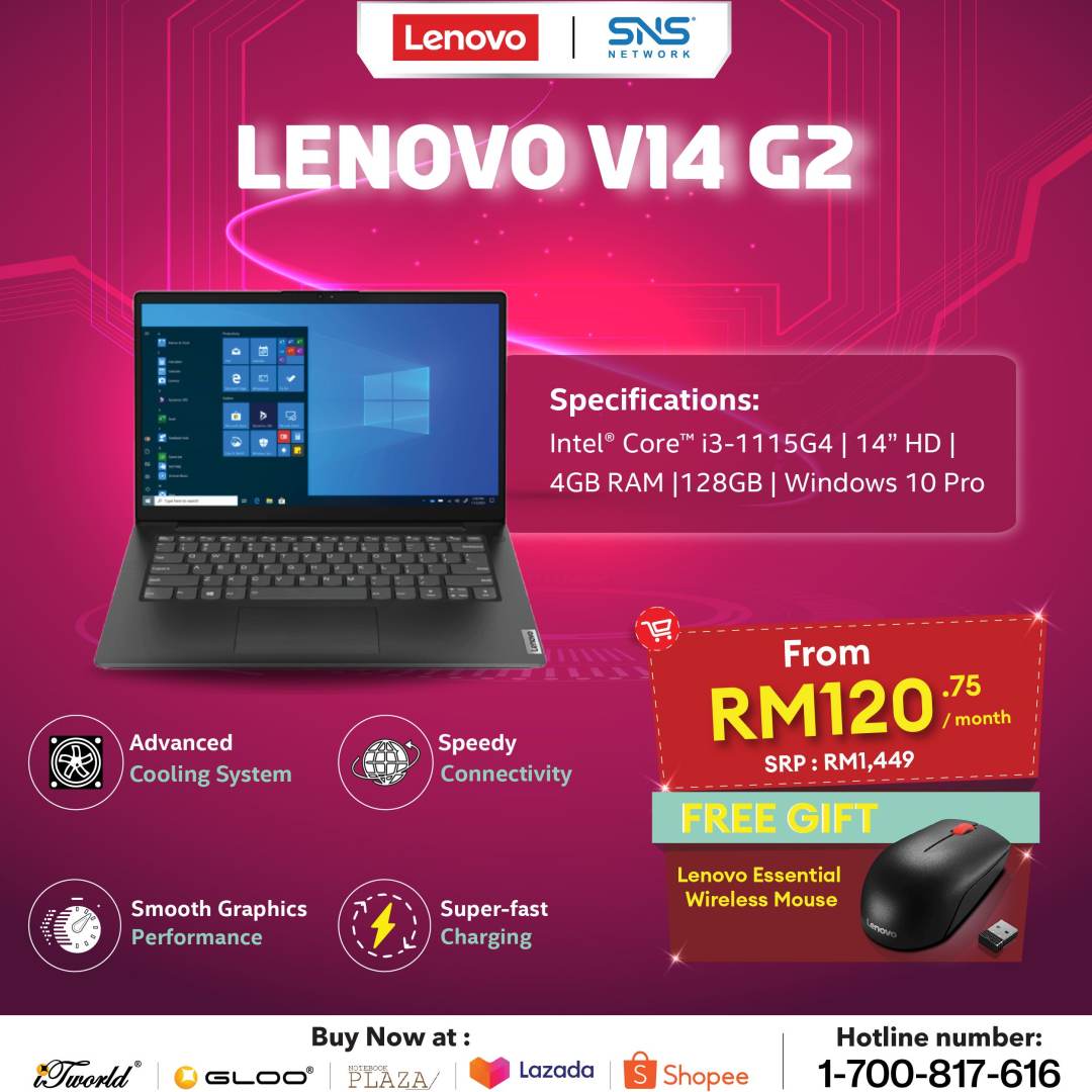 Dapatkan Lenovo V14 segera menerusi link yang berikut, ada bermacam hadiah percuma untuk setiap pembelian:
