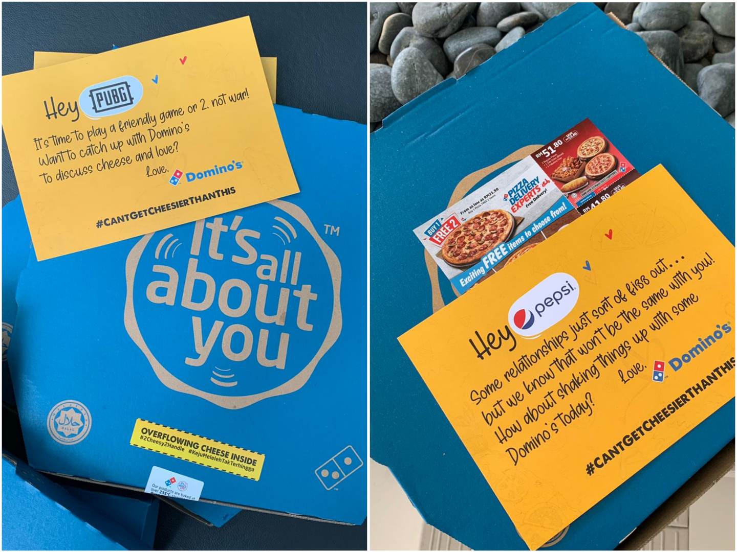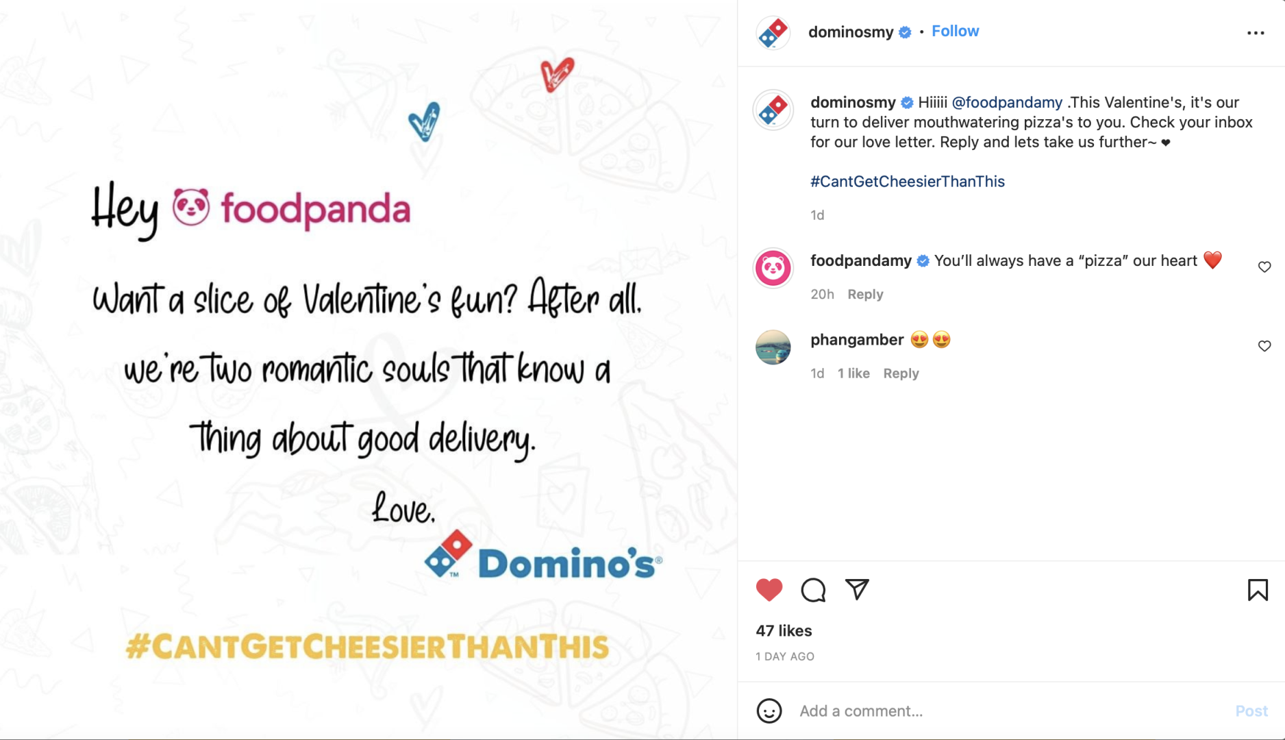 To celebrate Valentine's Day, Domino's Pizza Malaysia created a Valentine's Day campaign in which they freely declared their love for fun brands such as PepsiCo Malaysia, Grab, Food Panda, Lazada, PUBG Mobile and more by posting cheesy pick-up lines on various social media platforms.