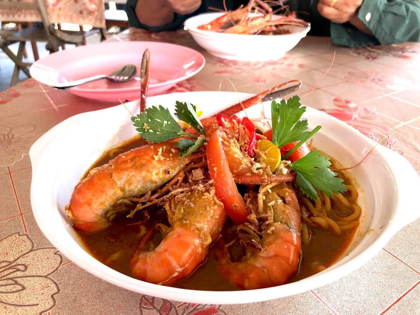 Udang galah memang menjadi menu utama di sini. Disebabkan itu kebanyakan menu di sini akan dihidangkan sekali dengan udang galah. Antaranya ialah mee rebus udang galah, nasi beriyani udang galah, mee goreng udang galah & mee bandung udang galah. Mengikut bajet masing-masing pengunjung boleh pilih sendiri saiz udang galah yang hendak dimakan.