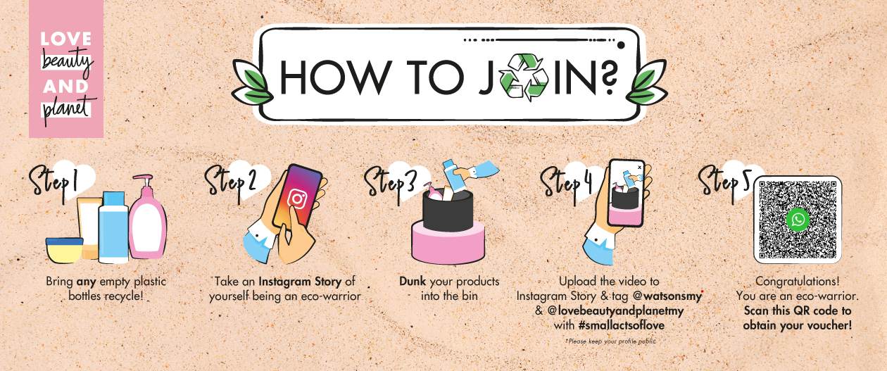 Korang boleh ke Watsons untuk kitar semula botol plastik dan sebagai ganjaran, korang akan diberikan baucar oleh Love Beauty and Planet yang boleh korang gunakan di Watsons.